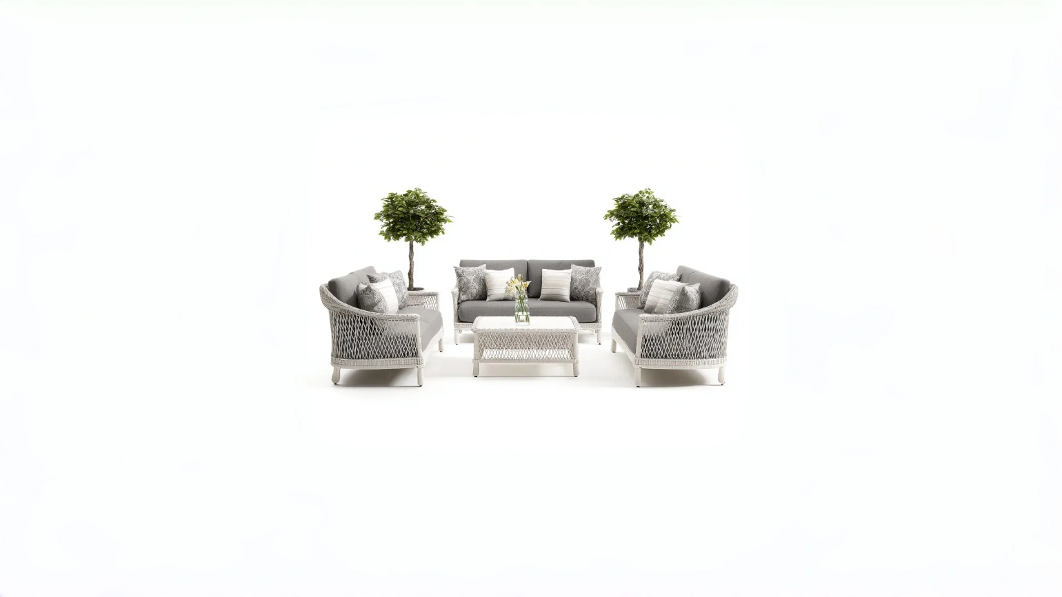 Composizione da esterno progettata per offrire comfort e continuita visiva in spazi outdoor come giardino, terrazza o veranda. L'insieme comprende un divano da esterno, una poltrona da esterno e un tavolino coordinato, con proporzioni bilanciate e utilizzo versatile.